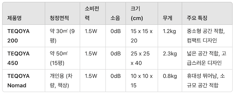 • 제품별로 청정 가능한 면적이 제한적입니다. 예를 들어, TEQOYA 200은 30㎡ 정도의 공간에 적합하며, 이보다 넓은 공간에서는 추가 제품이 필요할 수 있습니다. “넓은 거실이나 사무실에서는 성능을 완전히 발휘하기 어려워 보조적인 용도로 사용하고 있다”는 사용자 피드백도 있었습니다.