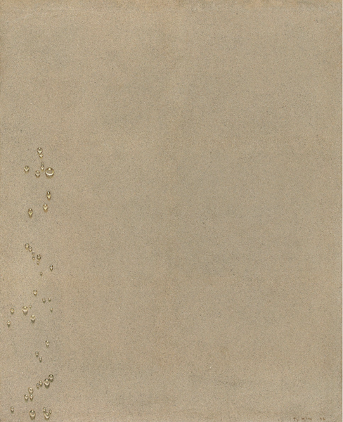 작가는 마대의 거친 표면에 물방울을 그리기 시작합니다. 이는 거친 표면이라는 물체의 즉물성을 살리는 반면, 이러한 표면에 맺힐 수 없는 영롱한 물방울을 극사실적으로 그림으로써 바탕과 이질감을 형성하여 실제 물방울이 가진 물질성을 상실하게 합니다. 1980년대 후반에 이르면 단순한 마대에서 나아가 바탕에 천자문을 그려넣음으로써 동양의 철학을 나타내기 시작했습니다. 이 시기의 대표작으로는 마대에 물방울들이 몰려있는 <물방울>(1987), 천자문 위에 물방울들이 그려진 <회귀>(1989) 등이 있습니다.